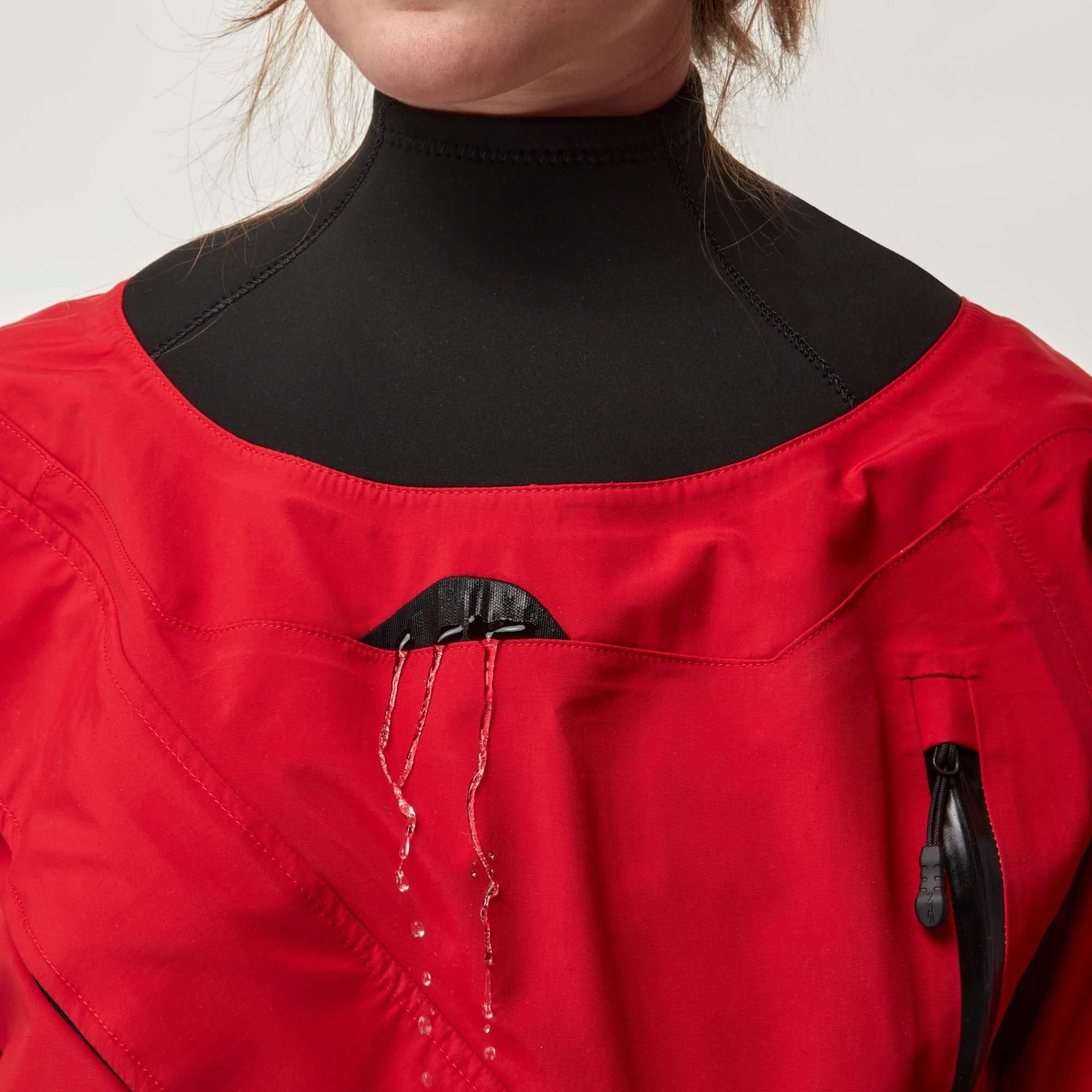 Œillets de drainage aux poignets et au cou permettant l’évacuation rapide de l’eau infiltrée.