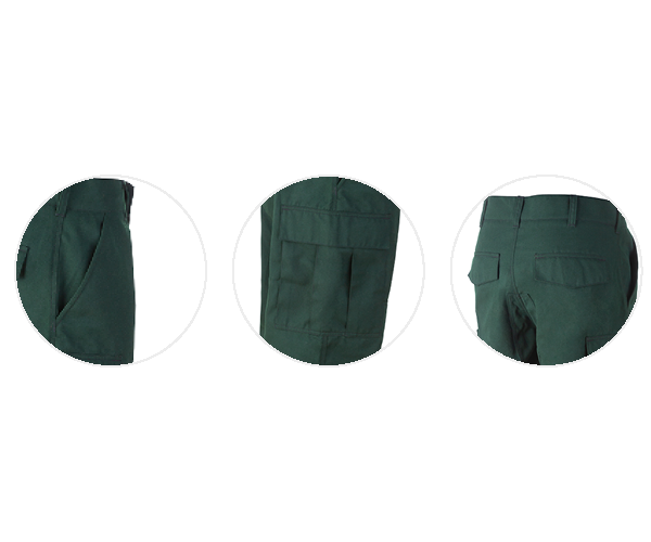 Les coutures sont réalisées en fil Nomex®, avec renforts aux points critiques. La structure globale du pantalon supporte les contraintes répétées : lavage intensif, frottements, tension.